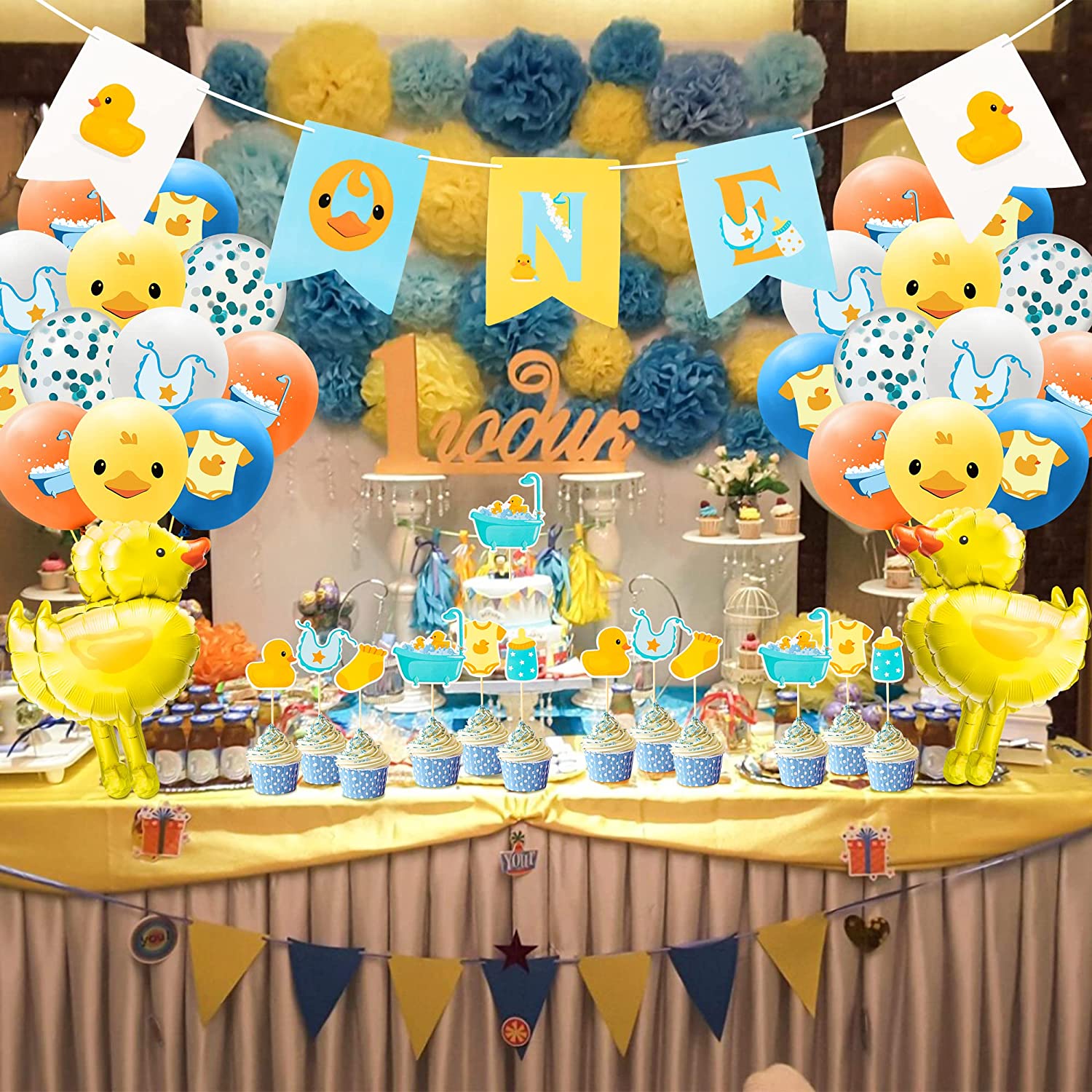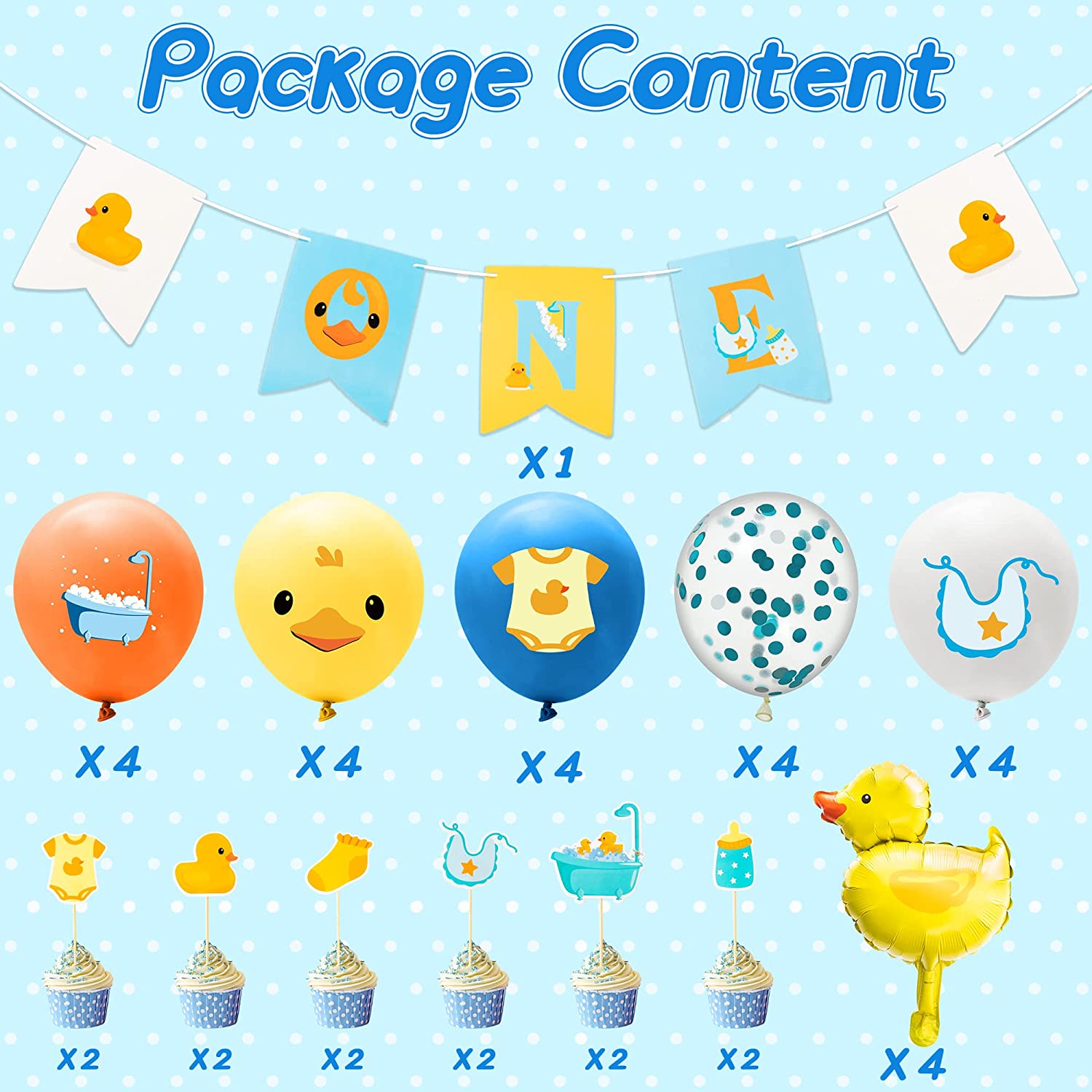 - Ample Quantity: The package contains 20 pieces of latex balloons(5 styles), 12pcs cake toppers (6 patterns), 4pcs yellow duck shape foil balloons and 1pcs ONE banner.