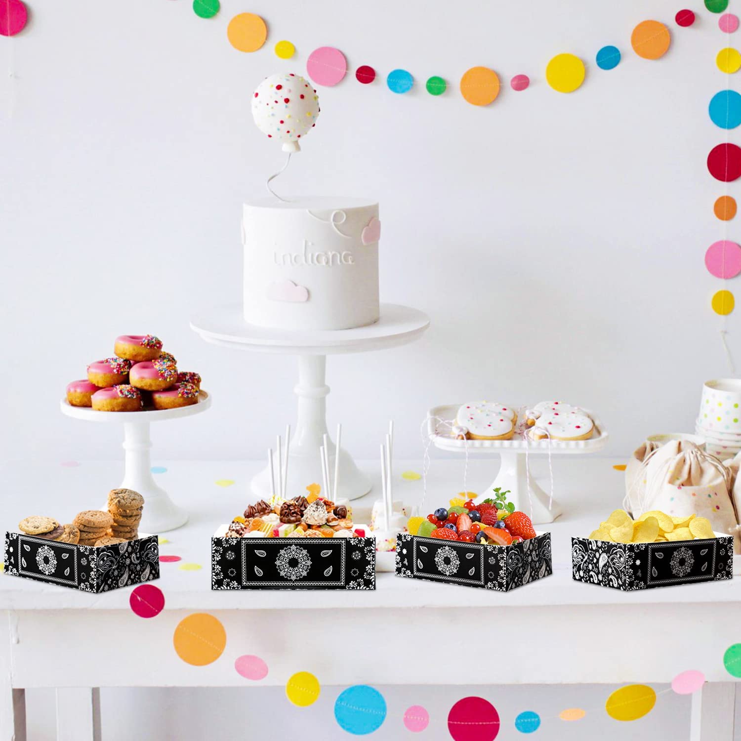 - Applicable Occasions: These black bandana paper serving trays can be put into use for birthday parties, carnivals, picnic, indoor outdoor parties, anniversaries, celebrations, family gatherings and various theme parties, to hold hot dogs, popcorn, nachos and other snack food.